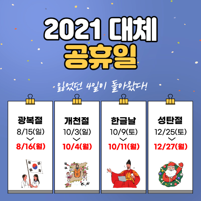 국경일 법정기념일 공휴일 바로 알기 from t1.daumcdn.net 국회의 이 같은 대체공휴일 확대 추진은 내수 진작 때문인데, 여야 모두 경쟁적으로 법안을 내놓고 있는 상황이다. 대체 공휴일은 2014년부터 본격적으로 실시된 제도입니다. 따라서 6월 국회에서 처리될 가능성이 높다. 당장 8월15일 광복절부터 법안을 적용토록 하겠다고 하고 있습니다. Jun 08, 2021 · 대체 공휴일을 적용하는 공휴일. Jun 16, 2021 · 대체공휴일 확대에 대해 국민은 대체로 찬성하는 입장이다. We would like to show you a description here but the site won't allow us. 대체공휴일은 공휴일이 토, 일요일에 겹치면 다음주 월요일날 휴무를 적용하는 제도입니다.